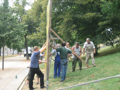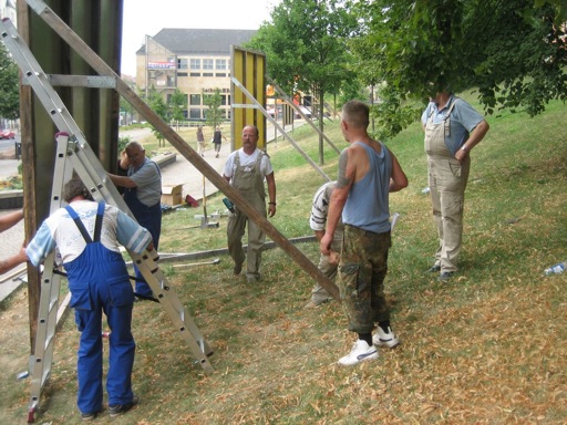 Diesen Sommer war es Rosemarie Vollmer, Lehrbeauftragte für Gestaltungslehre der Burg Giebichenstein, Hochschule für Kunst und Design Halle und seit 20 Jahren Mitglied der „Kunst an der Plakatwand“, die fünf Hallenser Künstler einlud, sich an der Ausstellung zu beteiligen und zugleich in der Oberbürgermeisterin der Stadt, Dagmar Szabados eine begeisterte Schirmherrin fand: „Halle freut sich!“