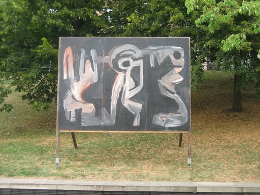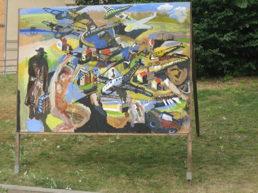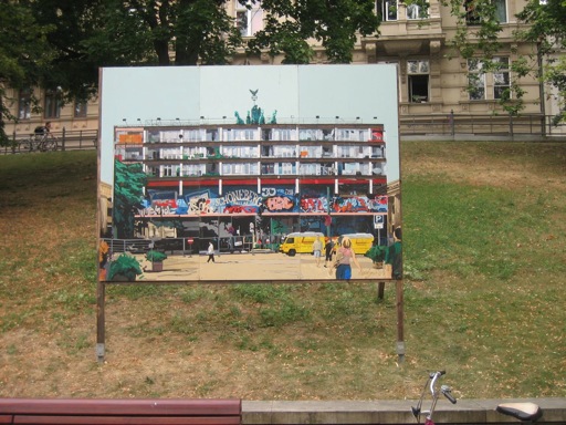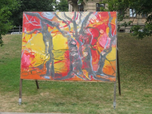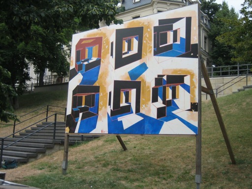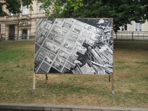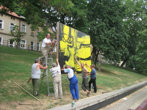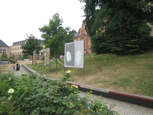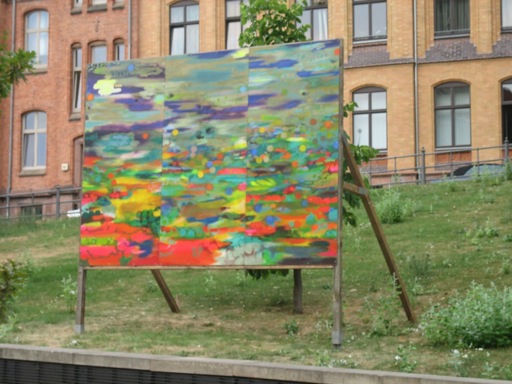 Den Ausstellungsraum, den die Gemälde in Halle einnehmen, erstreckt sich entlang der Allee des Hanserings vom Leipziger Turm bis zum Joliot-Curie-Platz. Jederzeit zugänglich, sich in ihre Umgebung mal einfügend, diese mal abstoßend, rhythmisieren die Plakatwände abwechslungs-reich die Grünflächen längs der Promenade. Ein Seitenwechsel lohnt sich also, um von der Straße zur Kunst zu gelangen. (Britta Borger, Juni 2010)