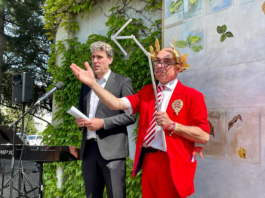Pfarrer Walter Boes und Clown Schorsch sprechen zu dem Gemälde "Bilderwelten" an der Lukaskirche.